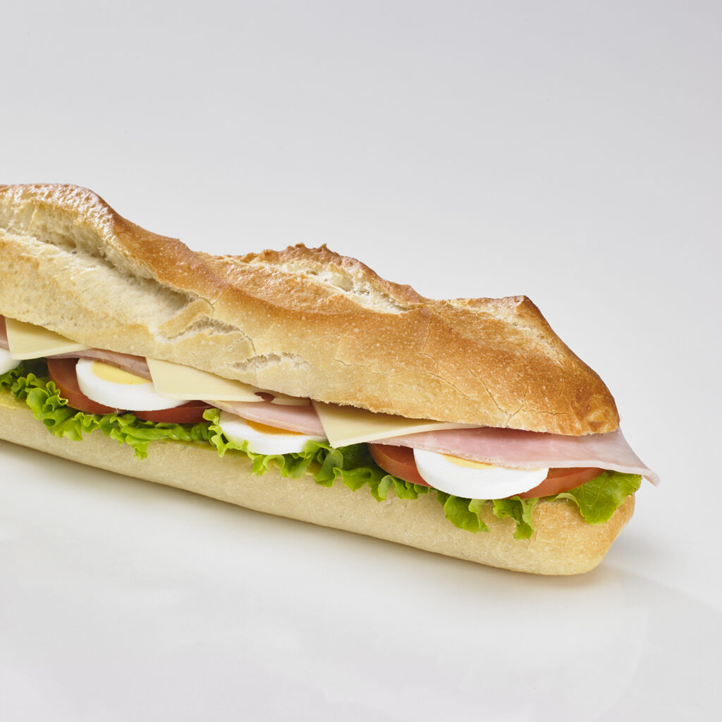 Une déjeunette croustillante garnie de jambon cuit supérieur, de fines tranches d'emmental, de rondelles de tomates, d'oeuf et de la sala...
