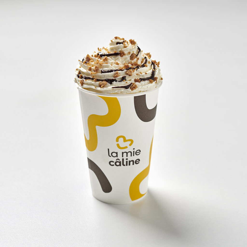 Un café au lait aromatisé au Spéculoos, surmonté de crème fouettée et de brisures de Spéculoos.