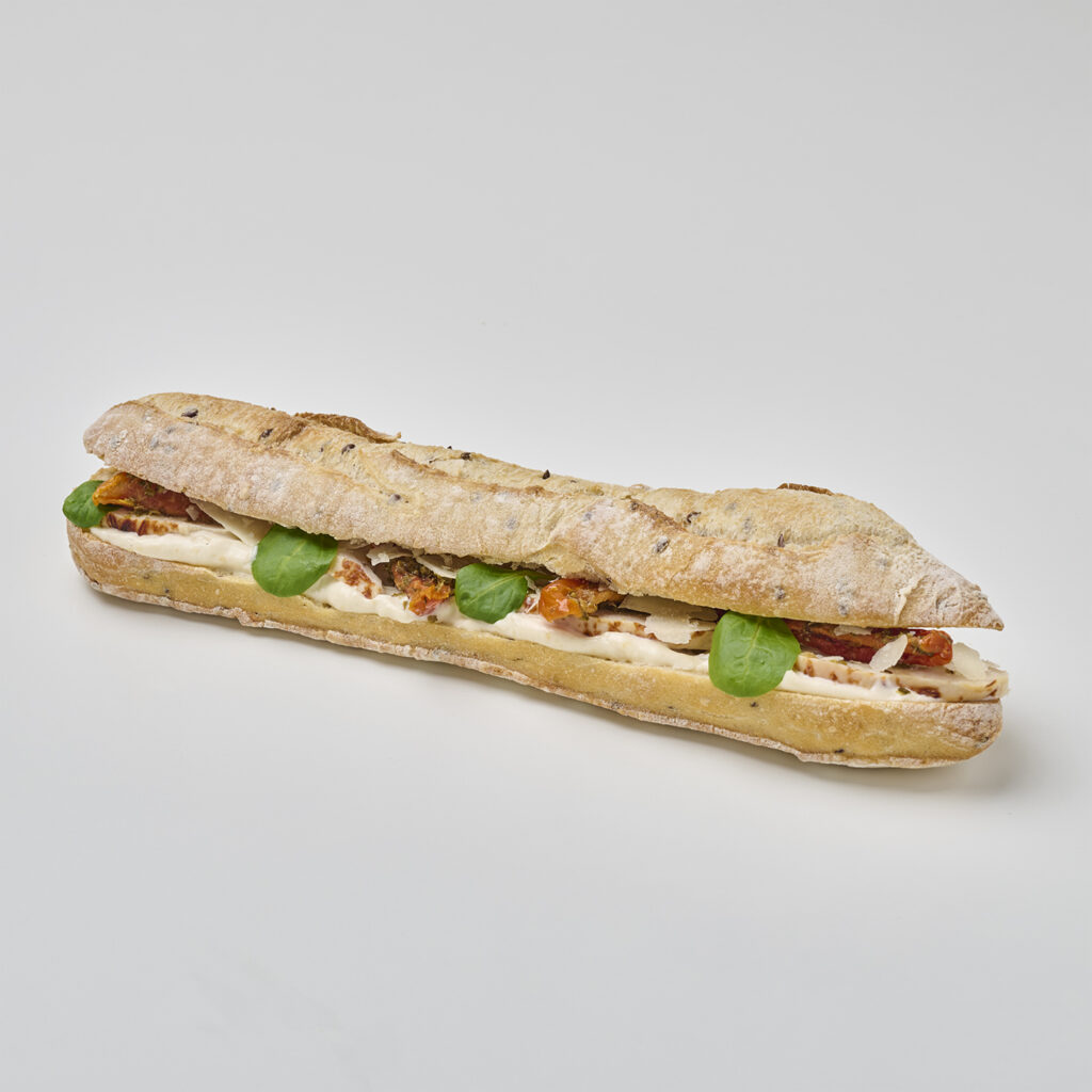 Délicieuse déjeunette baguette garnie d'émincés de poulet et de sauce moutarde à l'ancienne et de salade.