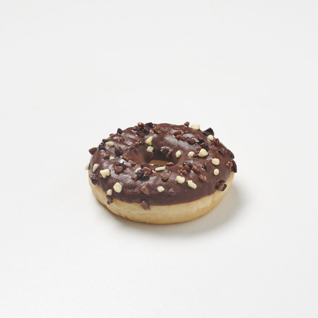 Un donut Fondant avec un glaçage et un fourrage chocolat, parsemé de pépites 3 chocolat blanc, lait et noir.